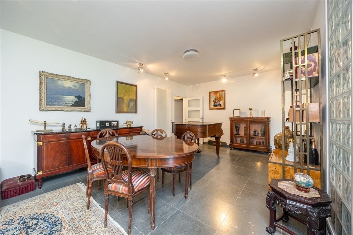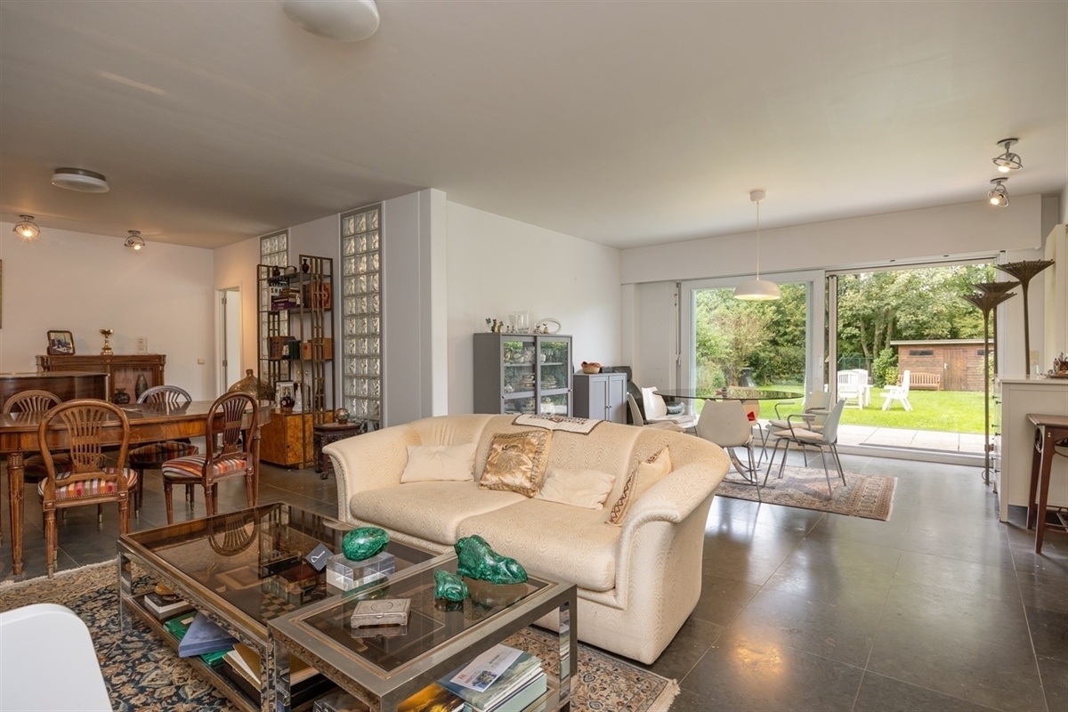 Royale en lichtrijke leef- en eetruimte op natuursteen, uitgevend op het terras en de tuin die zich over de volle breedte van het appartement uitstrekt en waar het heerlijk genieten is van de avondzon.