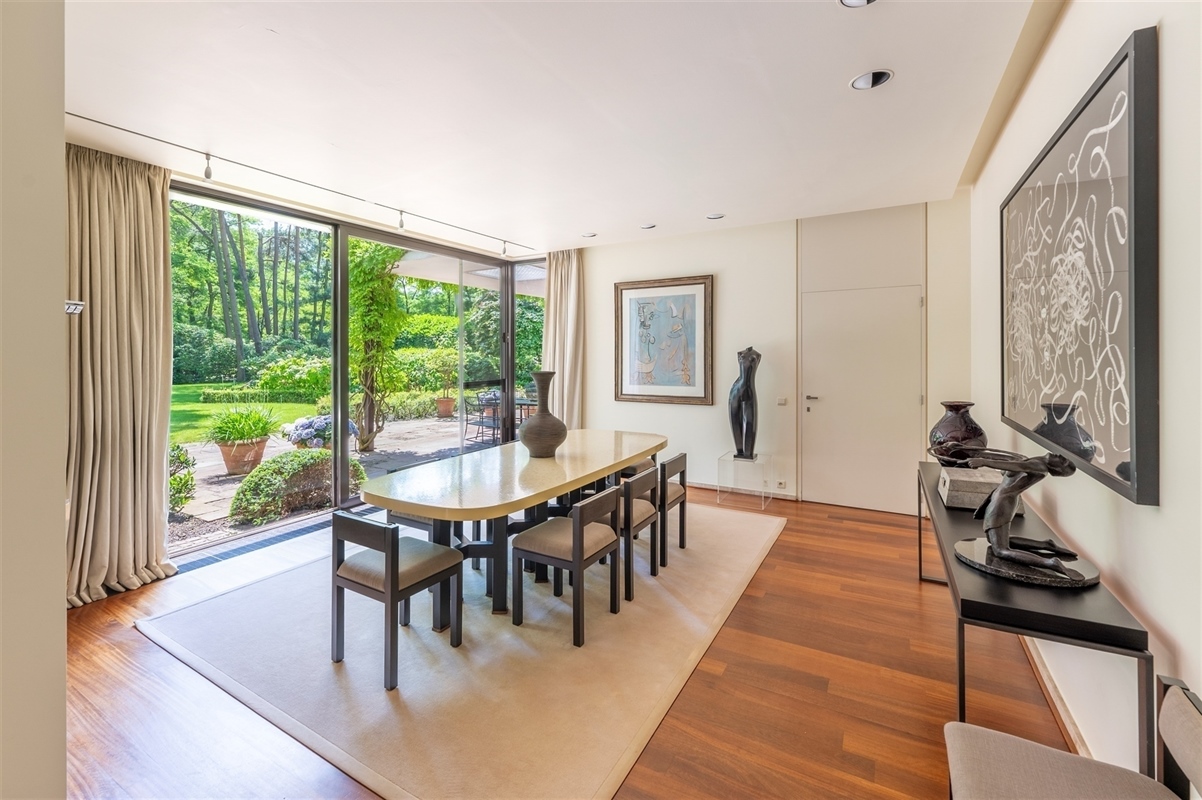 Zeer aangename leefruimte met veel ramen, natuurlijke lichtinval en groene tuinzichten.