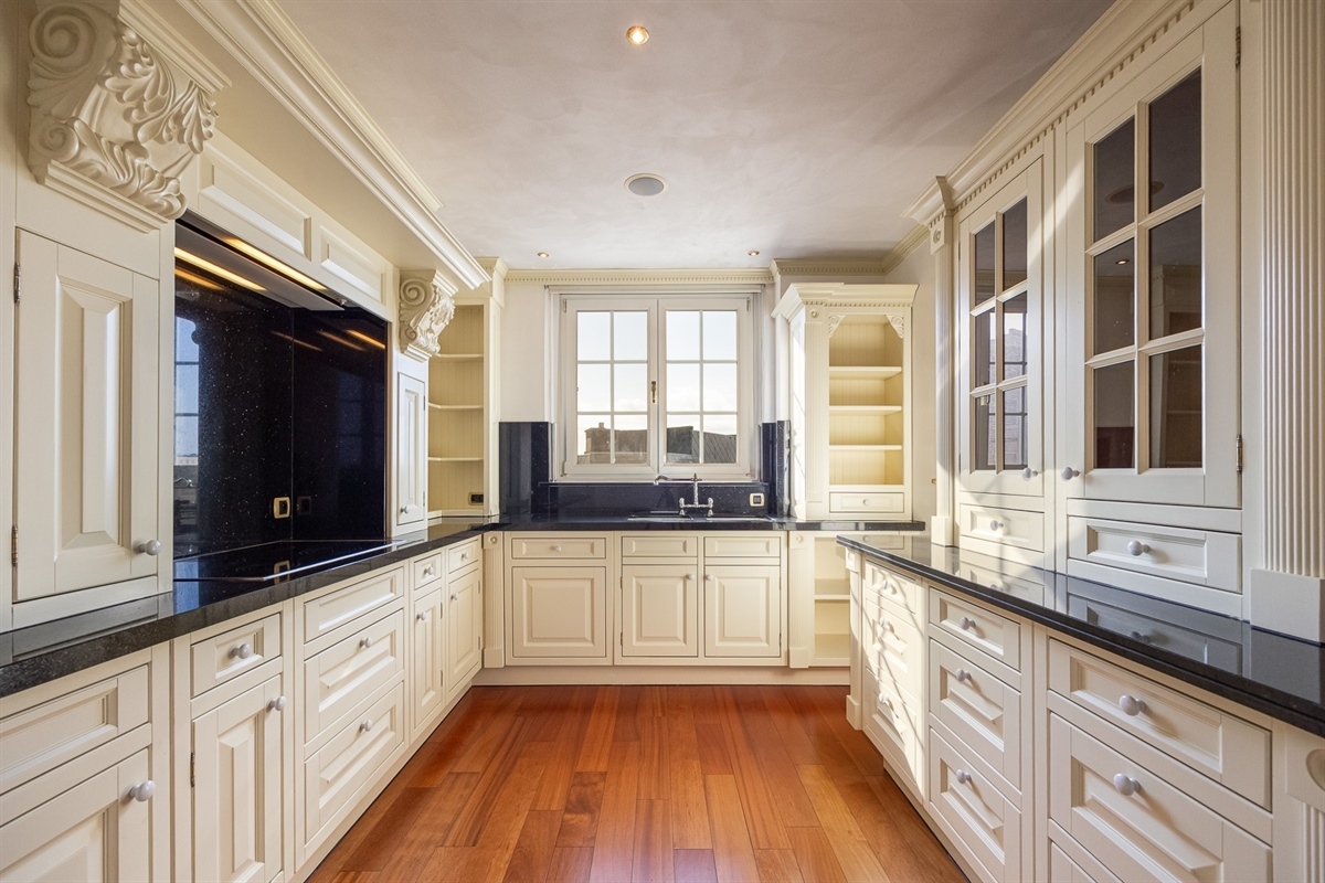 De keuken is zeer stijlvol en volledig uitgerust met een warme, authentieke uitstraling. Ze beschikt over talrijke ingemaakte kasten en een dubbele spoelbak in beschilderd Italiaans porselein.