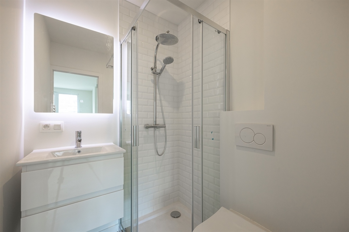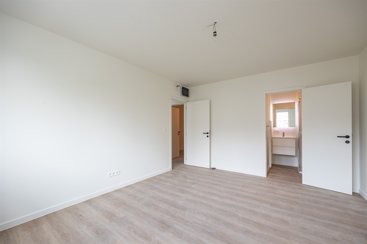 Slaapkamer 1 (ca 16m²) met aangrenzende badkamer (toilet, douche en lavabomeubel).